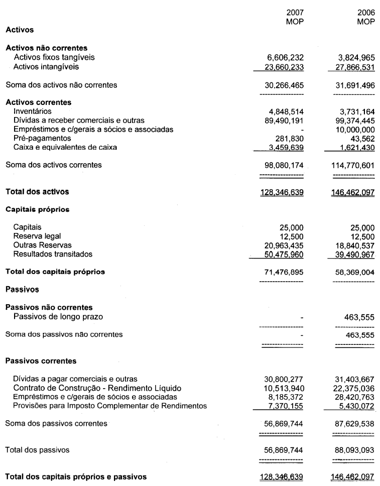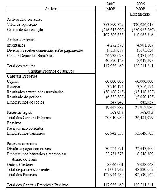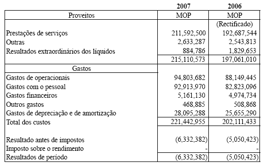 O exercício apurado da sociedade em 2007 foi de MOP$ 24 810 000,00, apresentando uma diminuição de receitas na ordem dos 18,52%. Face ao exercício do ano anterior, o lucro bruto também diminuiu em 12%, correspondente a MOP$ 6 010 000,00. Devido à implementação do rigoroso controlo de despesas, registou-se um prejuízo de MOP$ 240 000,00, o que significa uma enorme redução de 83,56% em relação ao ano anterior findo.