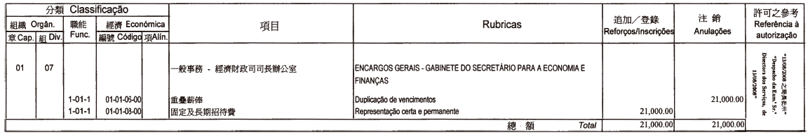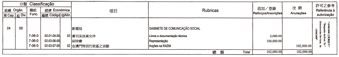 | 01 | 02 | 05 | 00 | 00 | Senhas de presença (nova rubrica) | 2,000.00 | |