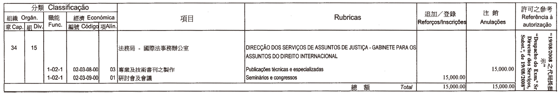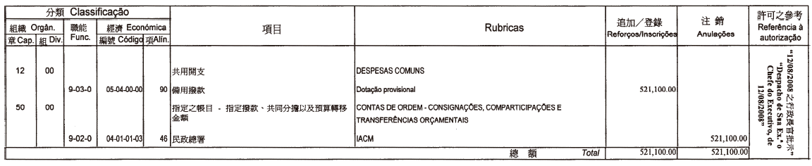 | 02 | 03 | 08 | 00 | 01 | Estudos, consultadoria e tradução | 100,000.00 | |