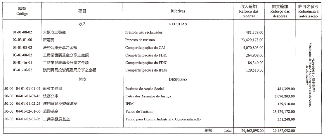 根據第6/2006號行政法規第三十九條第三款及第四十一條的規定,茲公佈經由終審法院院長辦公室管理委員會於二零零八年十月十七日批准及行政長官於二零零八年十月二十四日核准之終審法院院長辦公室二零零八年財政年度本身預算之第二次修改: