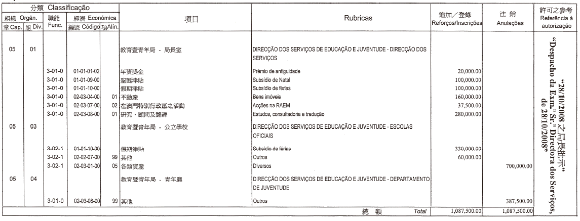 根據四月二十七日第21/87/M號法令第三條、第四條和第五條及十二月二十一日第86/89/M號法令之附件二取代之附表,以及十二月二十一日第87/89/M號法令核准,並經十二月二十八日第62/98/M號法令修訂之《澳門公共行政工作人員通則》第二十五條和第二十六條之規定,教學人員吳琍玲學士及李慧嫻學士之編制外合同以附註方式更改合同第三條款,分別為中葡中學教師,一級、第四階段及第三階段,薪俸點分別為590及525,各自由二零零八年十月十二日及十月十一日起生效。