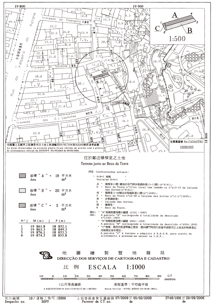 三、按照土地工務運輸局對該地點所訂定的街道準線,當土地重新利用時,須與相鄰一幅面積3平方米,屬於澳門特別行政區私產的地塊合併。這導致該等土地的所有人要將其所有權出讓,以便可以將該等土地與上述未在物業登記局標示的地塊一同以租賃制度批出。