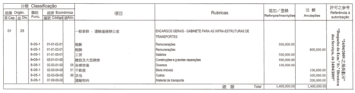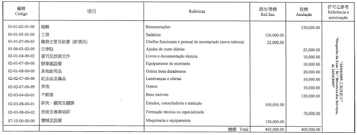 根據四月二十四日第6/2006號行政法規第四十一條的規定,現刊登經社會文化司司長二零零九年四月二十四日批示核准的體育發展基金二零零九年度本身預算第一次修改: