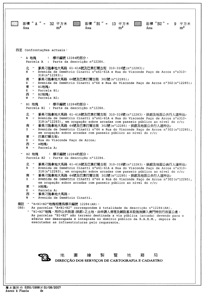 2. O terreno encontra-se demarcado e assinalado com as letras «A», «B1» e «B2» na planta n.º 5 351/1996, emitida pela Direcção dos Serviços de Cartografia e Cadastro (DSCC), em 31 de Agosto de 2007.