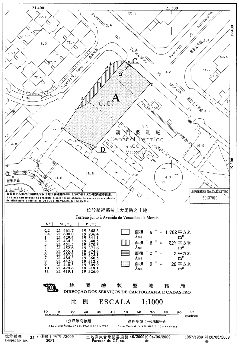十二、有關土地的面積為3,789平方米,在地圖繪製暨地籍局二零零六年十一月二十九日發出的第3779/1991號地籍圖中以字母“A”(3,284平方米)、“B”(340平方米)及“C”(165平方米)標示。