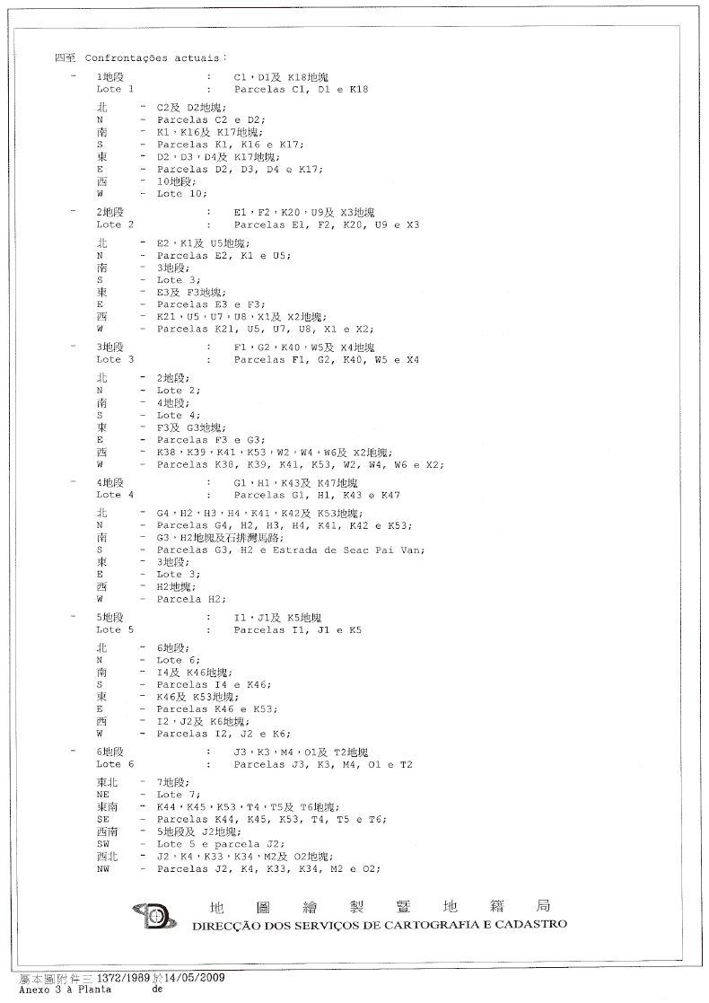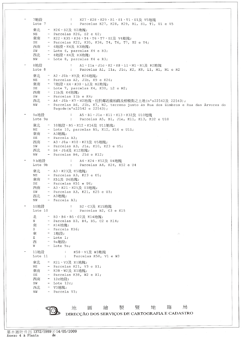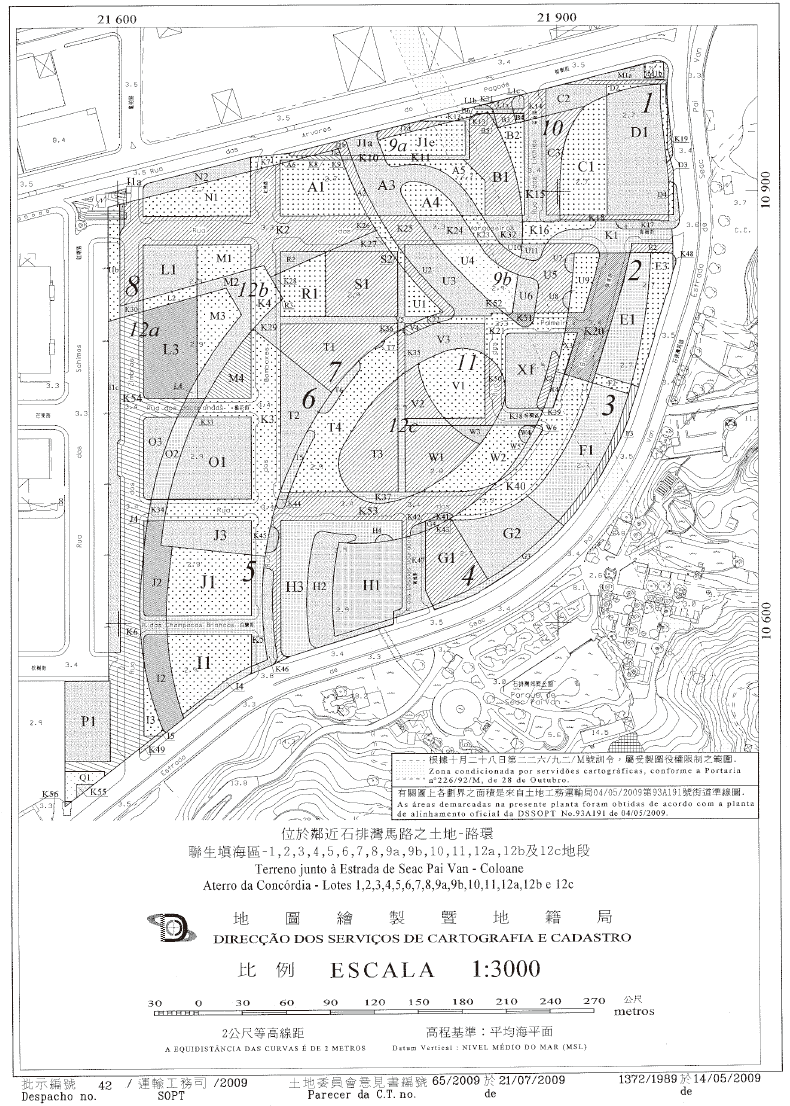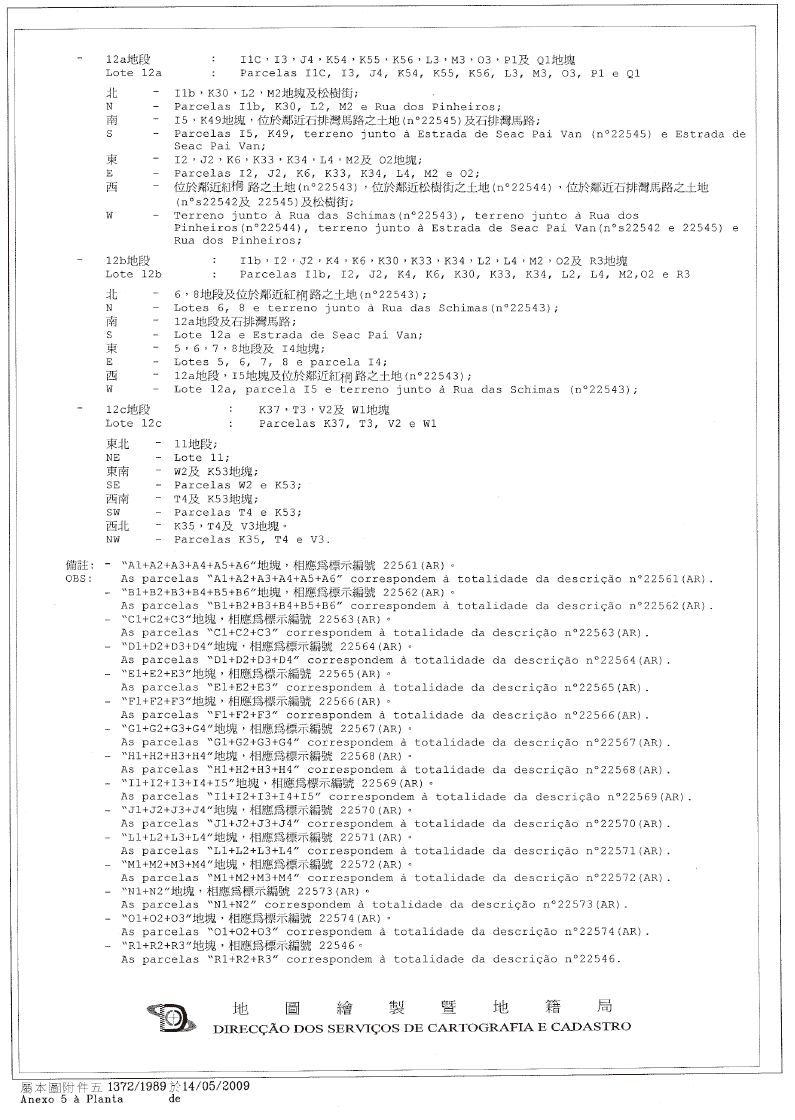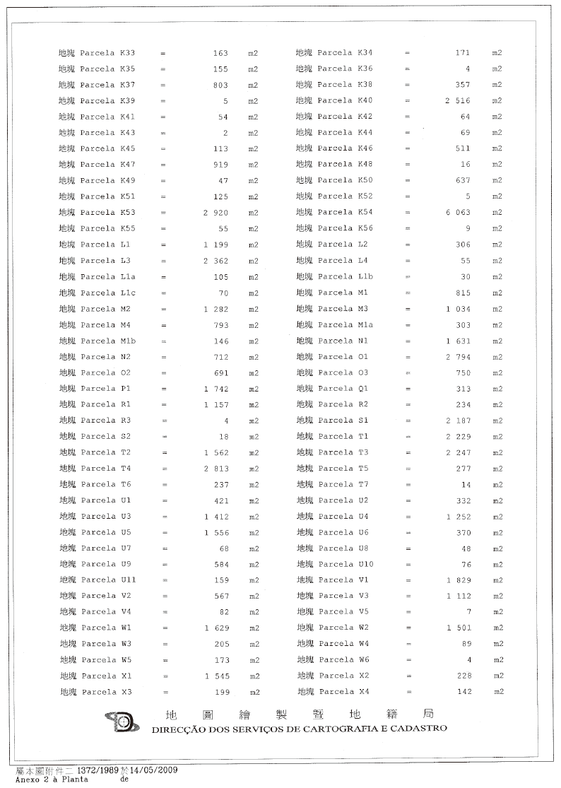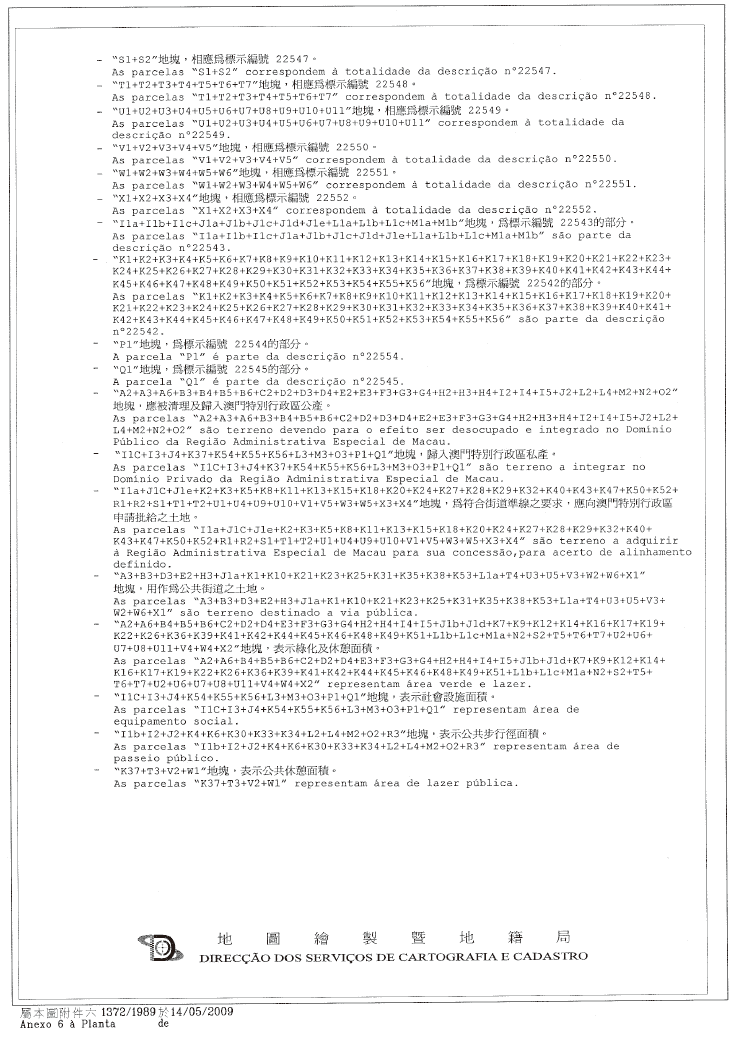 13. O terreno em apreço, com a área total de 70 651 m2, encontra-se demarcado e assinalado com as letras «A1», «A4», «A5», «B1», «B2», «C3», «D1», «E1», «F1», «F2», «G1», «G2», «H1», «I1», «I1a», «J1», «J1c», «J1e», «J3», «K2», «K3», «K5», «K8», «K11», «K13», «K15», «K18», «K20», «K24», «K27», «K28», «K29», «K32», «K40», «K43», «K47», «K50», «K52», «L1», «M1», «M4», «N1», «O1», «R1», «R2», «S1», «T1», «T2», «U1», «U4», «U9», «U10», «V1», «V5», «W3», «W5», «X3» e «X4» na planta cadastral n.º 1 372/1989, emitida pela Direcção dos Serviços de Cartografia e Cadastro (DSCC), em 14 de Maio de 2009 e constitui parte dos prédios descritos na Conservatória do Registo Predial (CRP) sob os n.os 22 542 e 22 543 a fls. 10 e 11 do livro B54K, 22 546 a 22 552 a fls. 14 a 20 do livro B54K e os n.os 22 561 a 22 574, a fls. 29 a 42 do livro B54K.