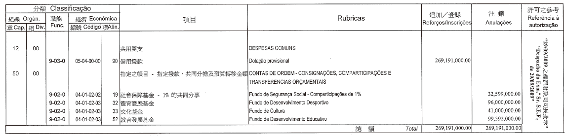根據四月二十四日第6/2006號行政法規第四十一條之規定,公佈二零零九年財政年度文化基金第四次預算修改,有關修改是經行政長官二零零九年十月二十二日的批示許可: