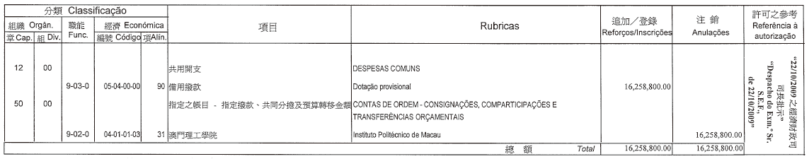 根據第14/2006 號行政命令核准的《澳門大學章程》第十八條第一款第五項的規定及於二零零六年九月十三日刊登於《澳門特別行政區公報》的通告,有關澳門大學校董會授予校董會常設委員會的職權,茲公佈經校董會常設委員會於二零零九年十月二十日核准之澳門大學二零零九年度本身預算第三次之修改: