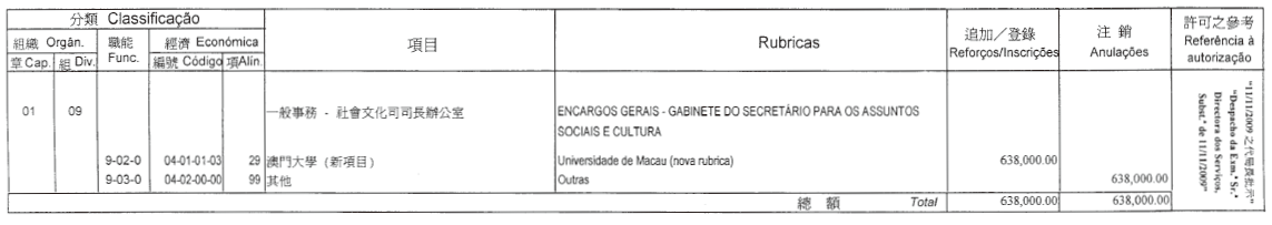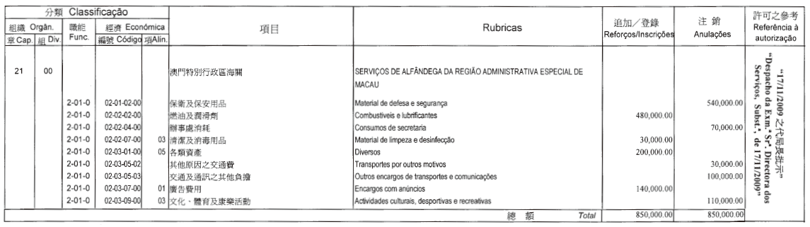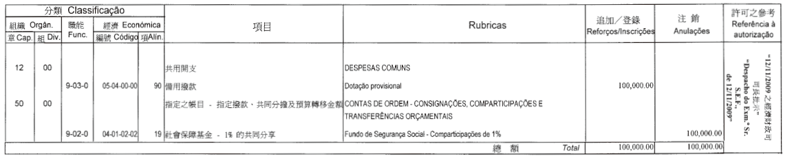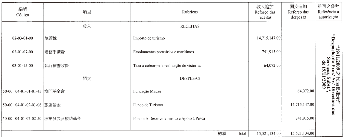 根據四月二十四日第6/2006號行政法規第四十一條之規定,公佈二零零九年財政年度文化基金第五次預算修改,有關修改是經行政長官二零零九年十一月二十日的批示許可: