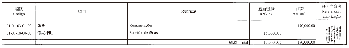 根據現行《澳門公共行政工作人員通則》第二十五條第三款及第二十六條第三款的規定,以附註形式修改Diamantino Delfim Lopes及馮惠琴在政府總部輔助部門擔任職務的編制外合同第三條款,轉為收取相等於第14/2009號法律附件一表二所列的第二職階二等行政技術助理員的薪俸點205點,由二零零九年十一月五日起生效。