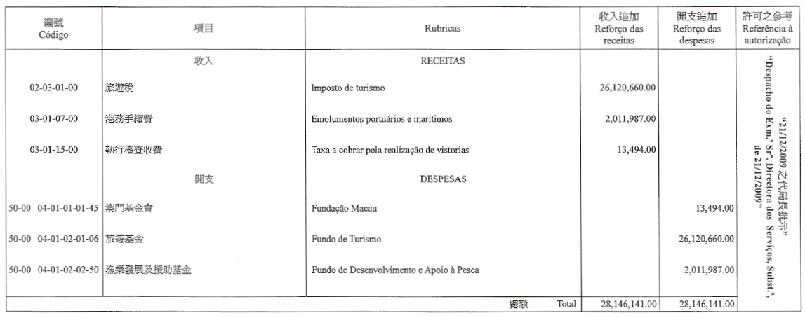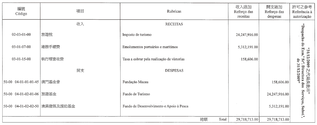 De acordo com o artigo 41.º do Regulamento Administrativo n.º 6/2006, de 17 de Março, e n.º 8 do Anexo I do Despacho do Chefe do Executivo n.º 347/2006, publica-se a 7.ª alteração orçamental do Fundo de Turismo de 2009, autorizado por despacho de S. Ex.ª o Chefe do Executivo, de 7 de Dezembro do mesmo ano: