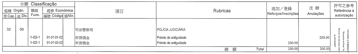 Zhang Yangui, progride a auxiliar, 2. º escalão, índice 120, com efeitos retroactivos a partir de 16 de Agosto de 2009;