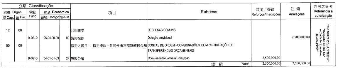 Comissariado contra a Corrupção, aos 21 de Dezembro de 2009. — O Chefe de Gabinete, Sam Vai Keong.