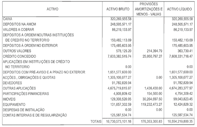 O Activo Líquido do Banco aumentou 3,7 por cento em 2009, ascendendo a 30 380 mil milhões de patacas em 31 de Dezembro de 2009, tendo a redução da carteira de crédito sido compensada pelo aumento das aplicações líquidas no mercado interbancário.