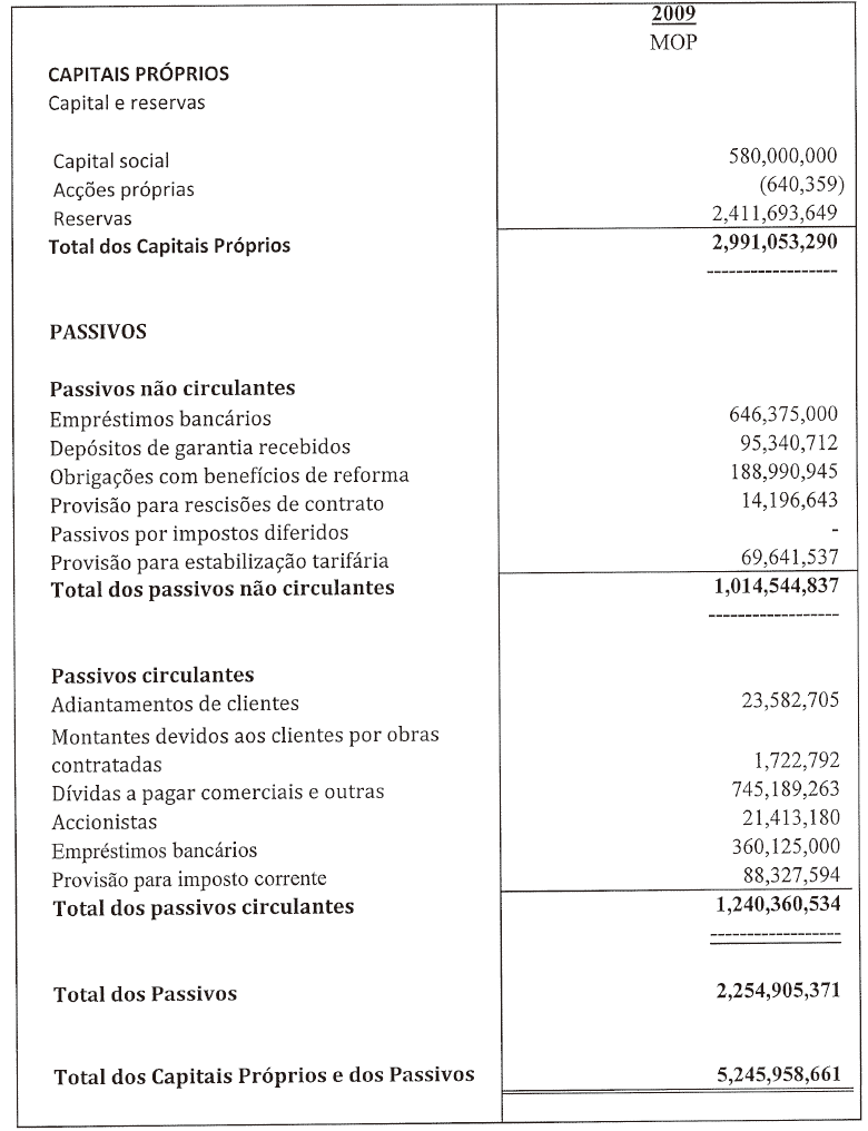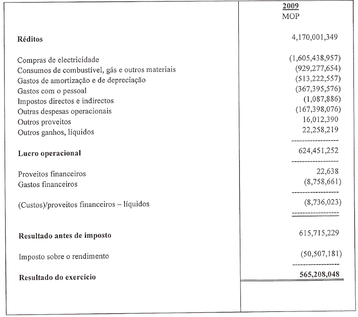 O Conselho de Administração da Companhia de Electricidade de Macau  CEM, S.A., submeteu ao Conselho Fiscal, nos termos da alínea e) do art.º 26.º dos Estatutos da Empresa, para dar parecer, as Demonstrações Financeiras, o Relatório do Conselho de Administração e a Proposta de Aplicação de Resultados respeitantes ao exercício de 2009. Posteriormente foi também enviado o Relatório do Auditor Independente «PricewaterhouseCoopers» sobre as referidas demonstrações financeiras, que compreendem um balanço, uma demonstração de resultados, uma demonstração das variações do capital próprio e um mapa de origem e aplicação de fundos.