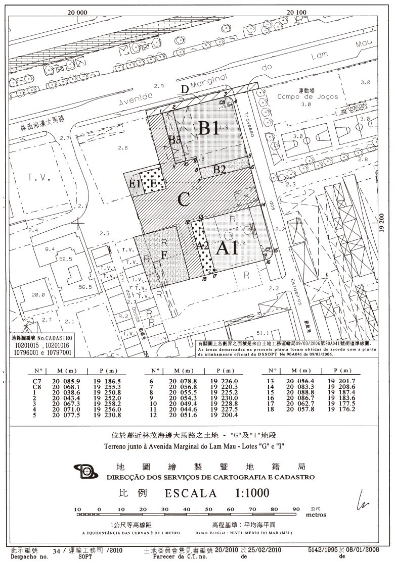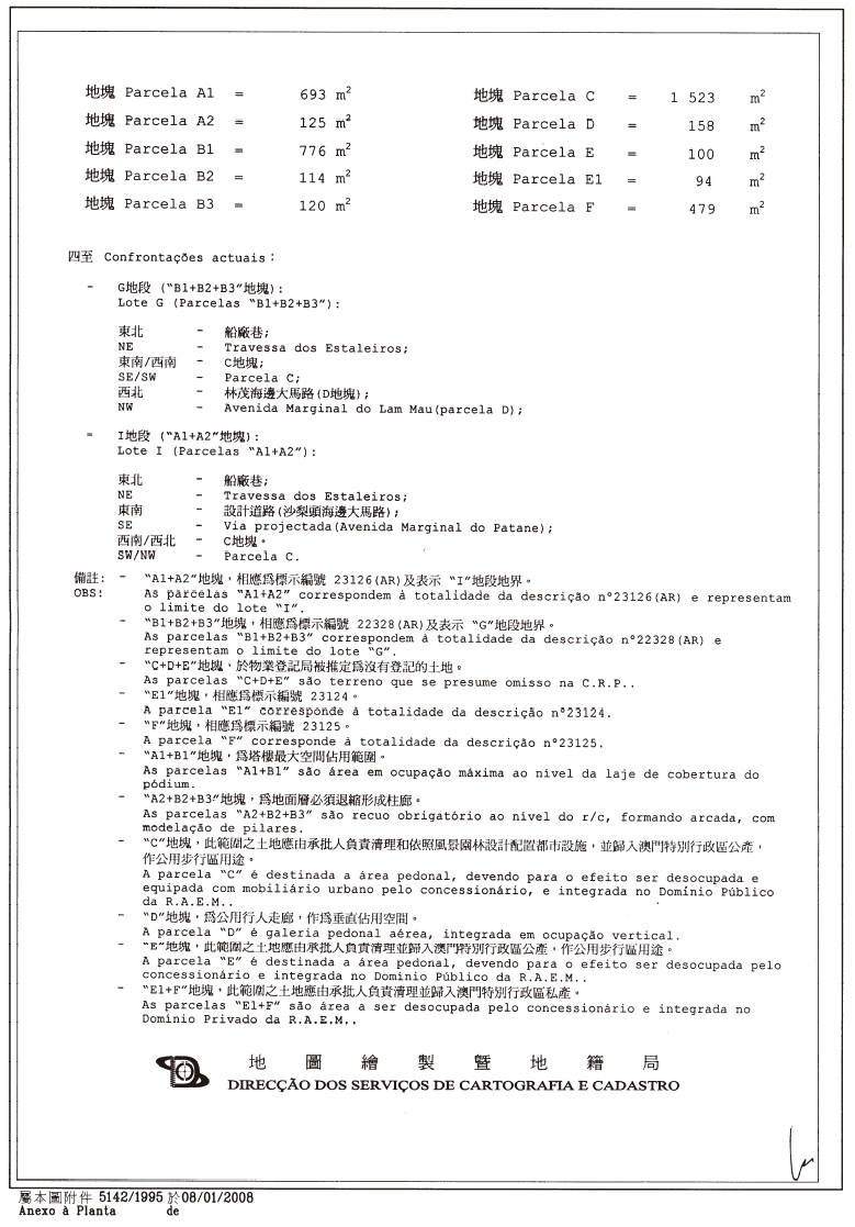 十一、合同標的之土地,面積為1,828平方米,在地圖繪製暨地籍局於二零零八年一月八日發出的第5142/1995號地籍圖中以字母“A1”、“A2”、“B1”、“B2”及“B3”定界及標示。以字母“B1”、“B2”及“B3”標示的地塊組成“G”地段,標示於物業登記局B13L冊第85頁第22328號,而以字母“A1”及“A2”標示的地塊組成“I”地段,標示於物業登記局第23126(B)號。