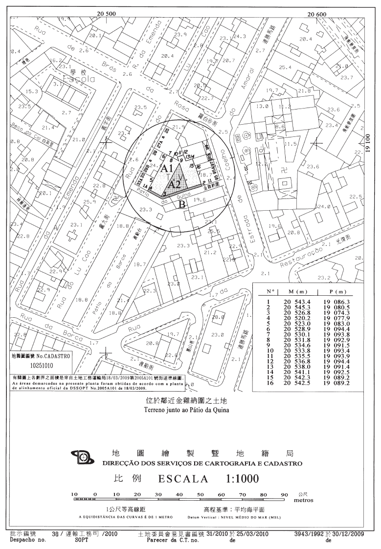 1)修改一幅以長期租借制度批出,面積341(叁佰肆拾壹)平方米,位於澳門半島,鄰近金雞納圍,由標示於物業登記局B25冊第36頁至第37頁第7433號至第7437號的農用房地產合併而成,在地圖繪製暨地籍局於二零零九年十二月三十日發出的第3943/1992號地籍圖中以字母“A1”、“A2”及“B”定界及標示,及其利用權以乙方名義登錄於第183017G號的土地的批給。