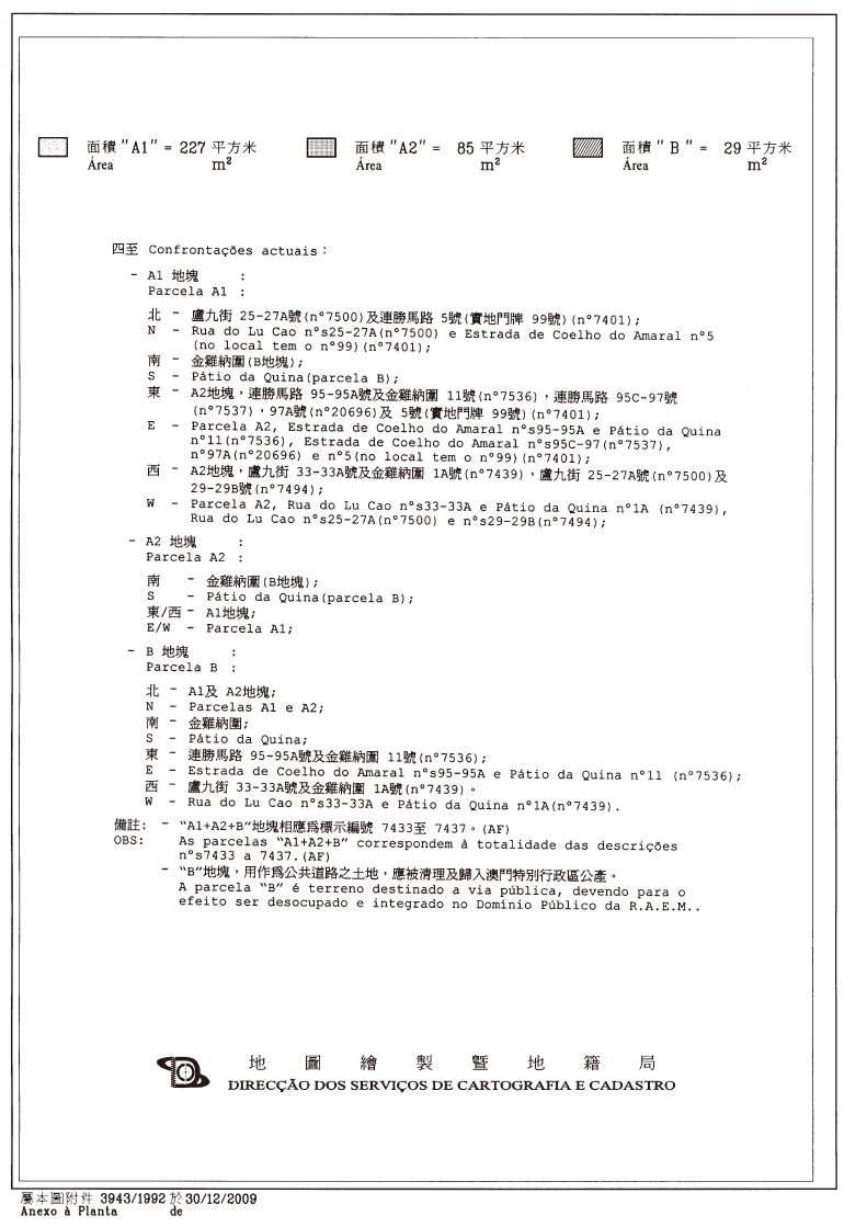 六、合同標的土地的面積為341平方米,在地圖繪製暨地籍局二零零九年十二月三十日發出的第3943/1992號地籍圖中以字母“A1”(227平方米)、“A2”(85平方米)和“B”(29平方米)定界和標示。