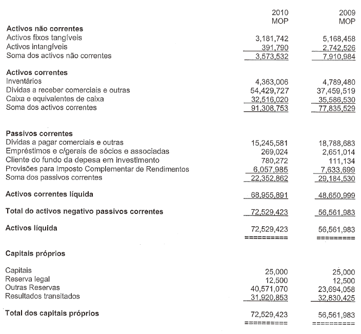 Activos descem 1 por cento para MOP 15 210 milhões (MOP 15 350 milhões em 2009).