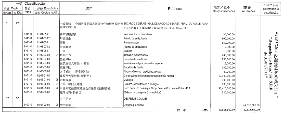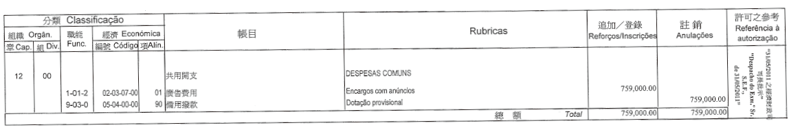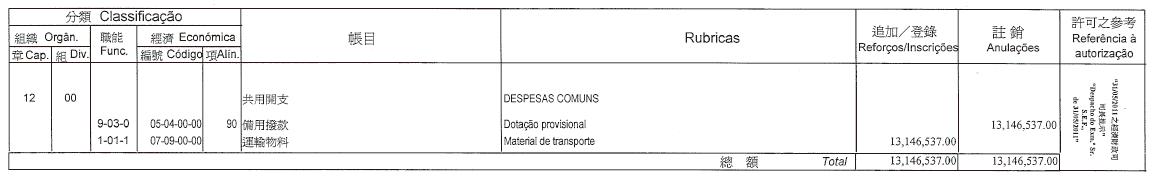 根據經第28/2009號行政法規修改之第6/2006號行政法規第四十一條第二款第二項及第四十三條的規定,茲公佈經由經濟財政司司長於二零一一年五月三十一日批示批准之終審法院院長辦公室二零一一年財政年度本身預算之第一次修改: