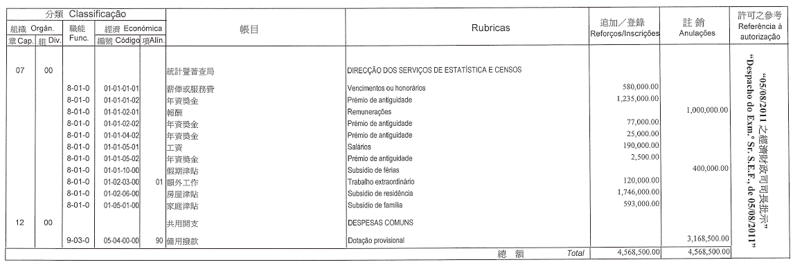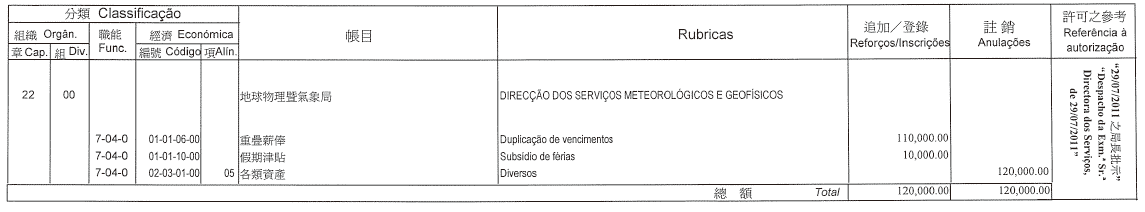 根據現行《澳門公共行政工作人員通則》第二十五條及第二十六條,以及第14/2009號法律第十四條第一款(二)項的規定,李展欣及周騫盈在本局擔任職務的編制外合同,以附註形式修改該合同第三條款,轉為收取相等於第一職階一等高級技術員職務的薪俸點為485,自二零一一年七月十二日起生效。