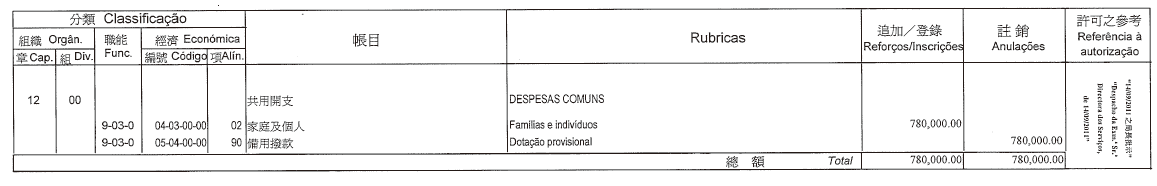 | 04 | 01 | 01 | 03 | 45 | Fundação Macau | 3,967,948.00 | |