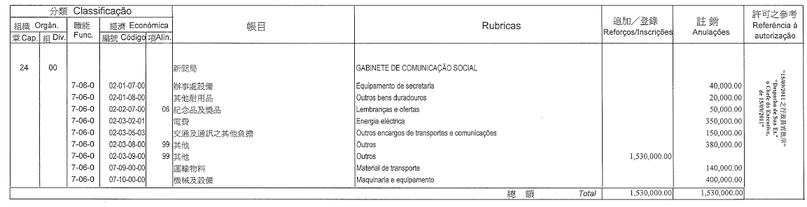 De acordo com o artigo 43.º do Regulamento Administrativo n.º 6/2006, alterado pelo Regulamento Administrativo n.º 28/2009, republicado pelo Despacho do Chefe do Executivo n.º 426/2009, publica-se a 3.ª alteração ao orçamento privativo da Assembleia Legislativa, para o ano económico 2011, autorizada por deliberação da Mesa da Assembleia Legislativa, de 12 de Setembro de 2011: