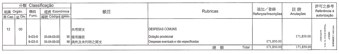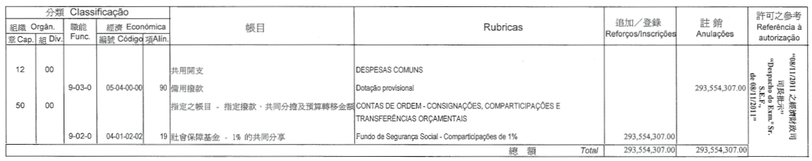 根據第12/2007號行政法規第二十四條及經第28/2009號行政法規修改,並經第426/2009號行政長官批示重新公佈的第6/2006號行政法規第四十一條第三款及第四十三條的規定,茲公佈經由審計長於二零一一年十月二十六日批示核准的審計署二零一一年度本身預算之第四次修改: