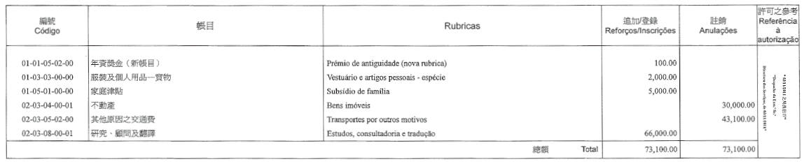 | 編號 | 開支名稱 | ||||||