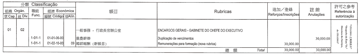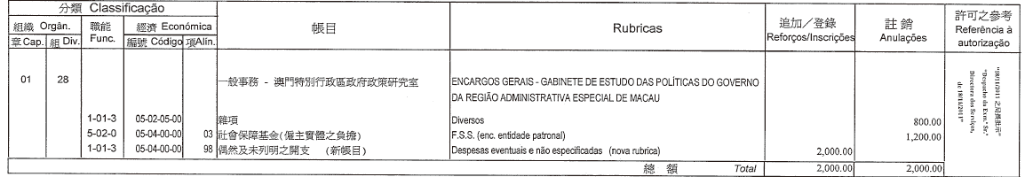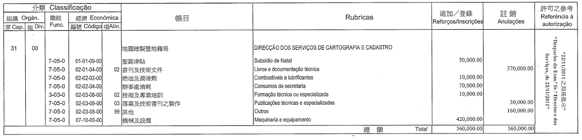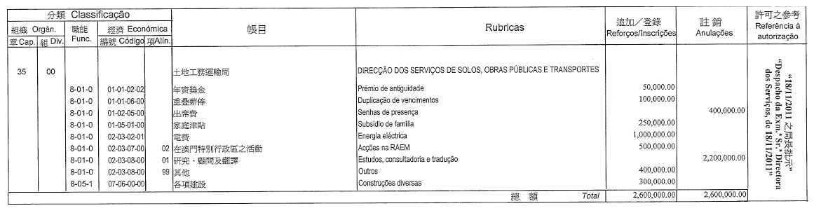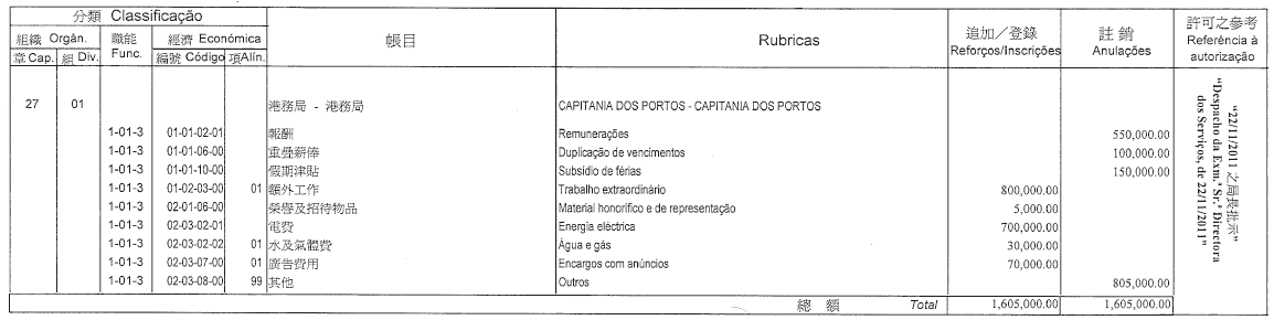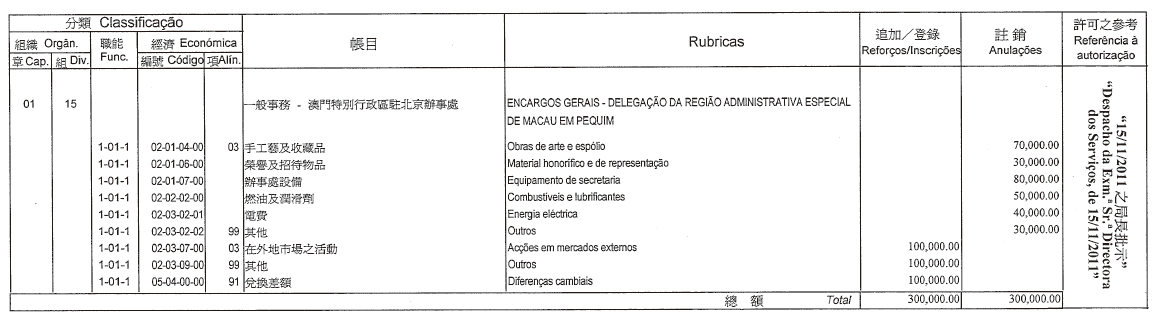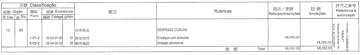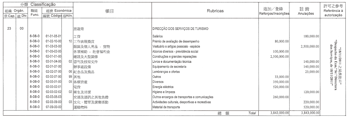 根據第426/2009號行政長官批示重新公佈的第6/2006號行政法規第四十一條之規定,公佈二零一一年財政年度文化基金本身預算第五次修改,有關修改是經社會文化司司長二零一一年十一月十七日的批示許可: