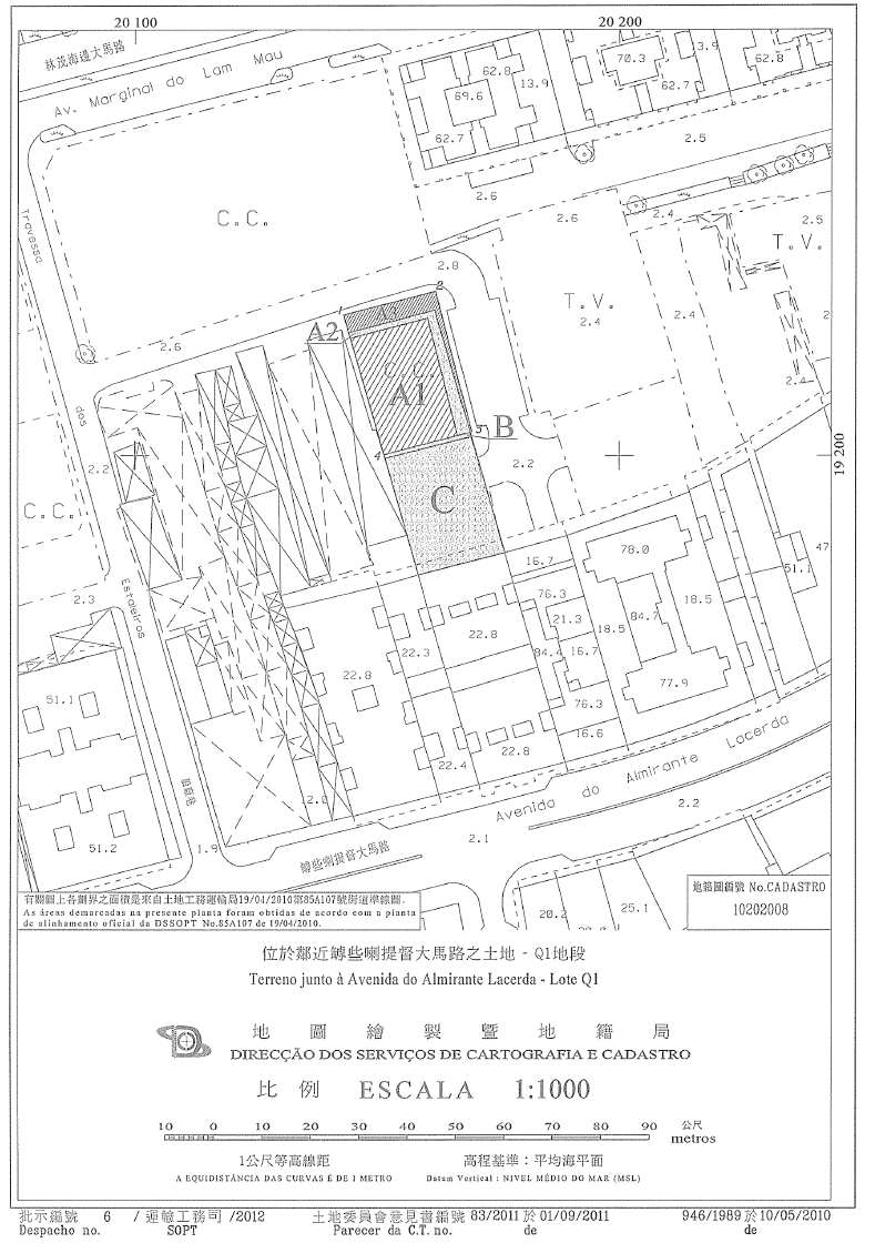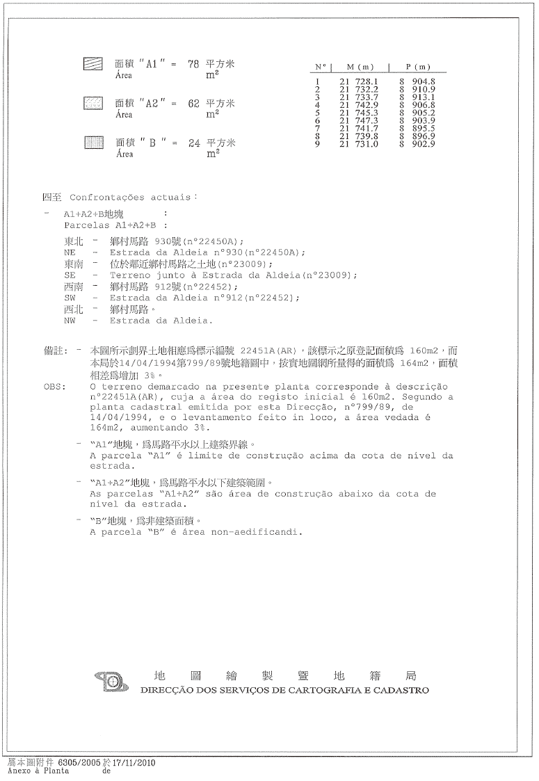 9. O terreno com a área de 2 742 m2, objecto da concessão titulada pelo Despacho n.º 30/SATOP/91, encontra-se demarcado e assinalado com as letras «A1», «A2», «A3», «A4», «A5», «A6», «A7» e «A8», com a área, respectivamente, de 2 260 m2, 277 m2, 138 m2, 28 m2, 16 m2, 7 m2, 13 m2 e 3 m2, na planta n.º 3 384/1991, emitida pela Direcção dos Serviços de Cartografia e Cadastro, adiante designada por DSCC, em 22 de Junho de 2011.