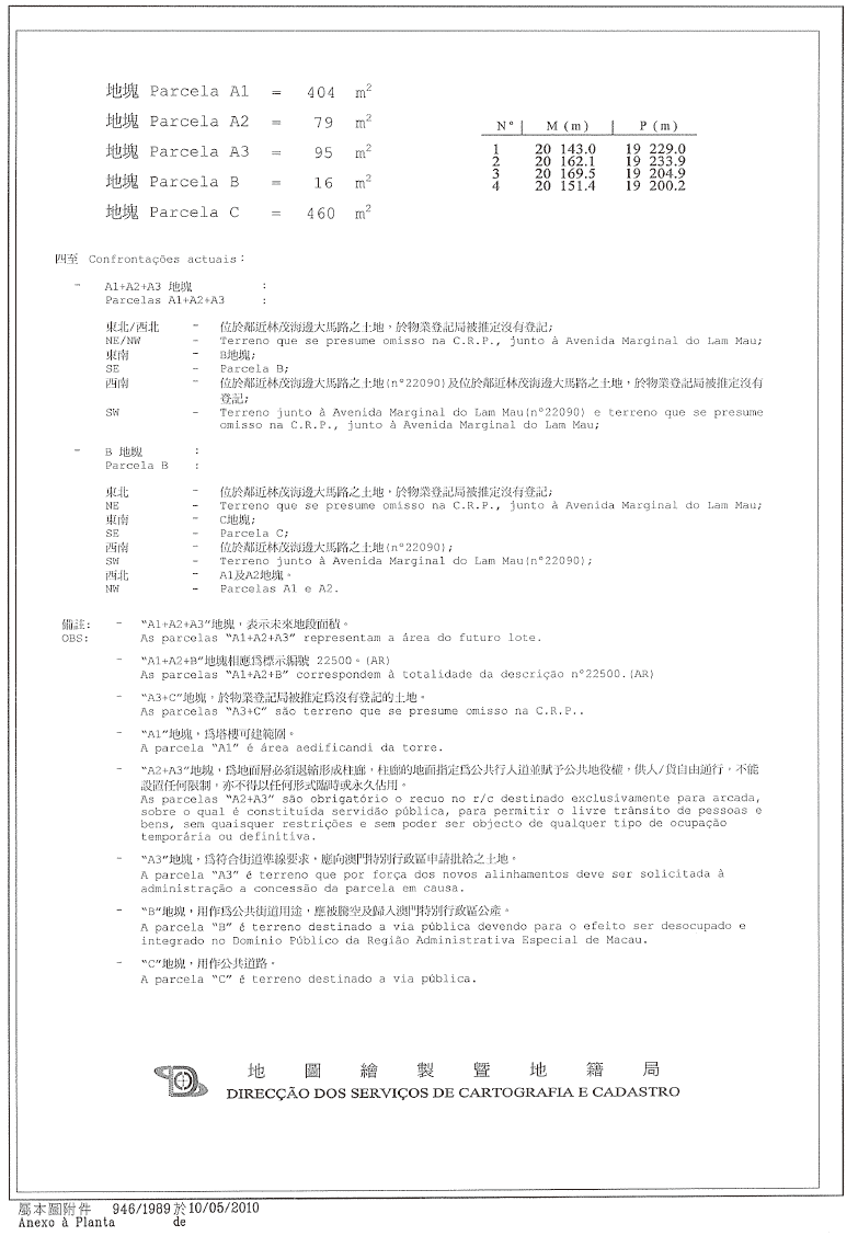7. A aludida parcela de terreno encontra-se ora assinalada com as letras «A1», «A2» e «B» na planta n.º 946/1989, emitida pela DSCC em 10 de Maio de 2010.