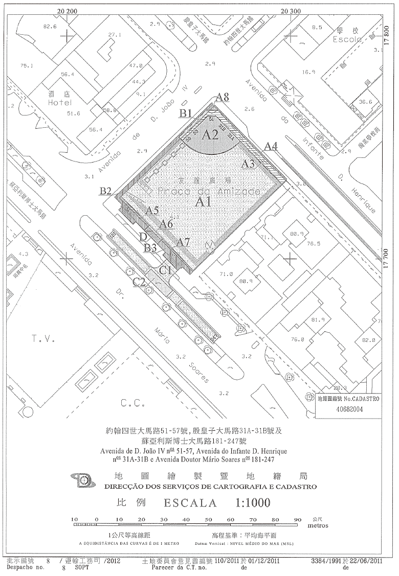 1) A revisão do contrato de concessão, por arrendamento, do terreno com a área de 2 742 m2 (dois mil, setecentos e quarenta e dois metros quadrados), sito na Praça da Amizade, assinalado com as letras «A1», «A2», «A3», «A4», «A5», «A6», «A7» e «A8» na planta n.º 3 384/1991, emitida pela DSCC em 22 de Junho de 2011, descrito na CRP sob o n.º 22 144 e cujo direito de concessão se encontra inscrito a favor do segundo outorgante sob o n.º 808, titulado pelo Despacho n.º 30/SATOP/91, publicado no suplemento ao Boletim Oficial de Macau n.º 10, de 11 de Março de 1991, onde se encontra construído, em subsolo, um edifício afecto a parque de estacionamento público e comércio;