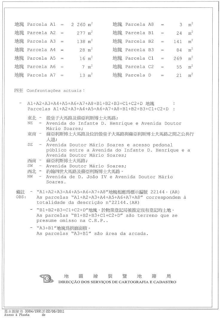 2. O referido terreno faz parte integrante do terreno com a área de 1 791 m2, situado na mesma avenida, onde se encontra construído o prédio n.os 15 e 17, descrito na CRP sob o n.º 10 755 a fls. 19 do livro B29, que, por força dos alinhamentos definidos para a zona onde se situa, foi dividido em três parcelas distintas, com as áreas de 832 m2, 460 m2 e 499 m2, nos termos do contrato de revisão de concessão titulado pelo Despacho n.º 157/SATOP/93, publicado no Boletim Oficial de Macau n.º 47, II Série, de 24 de Novembro.