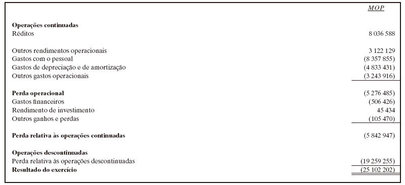 O resultado negativo, apurado no exercício findo, aumentou significativamente em relação ao exercício precedente, devido sobretudo à perda relativa a operações descontinuadas de uma subsidiária, integralmente detida por MACAUPORT, S.A.