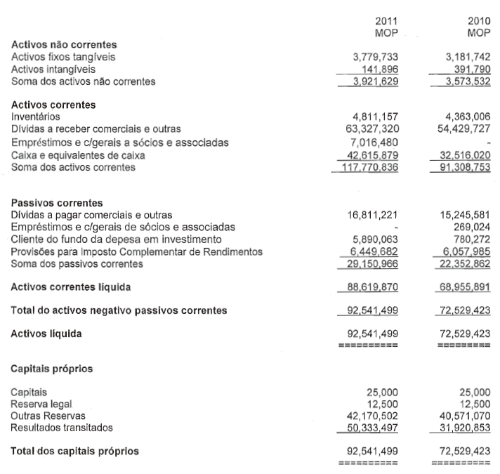 De acordo com as demonstrações financeiras auditadas do exercício findo a 31 de Dezembro de 2011, a Sociedade apresentou receitas no valor de 175,3 milhões de Patacas (2010: 168,3 milhões de Patacas), com um lucro líquido de 40 milhões de Patacas (2010: 40,9 milhões), correspondente a 22,8% das receitas (2010: 24,3%).