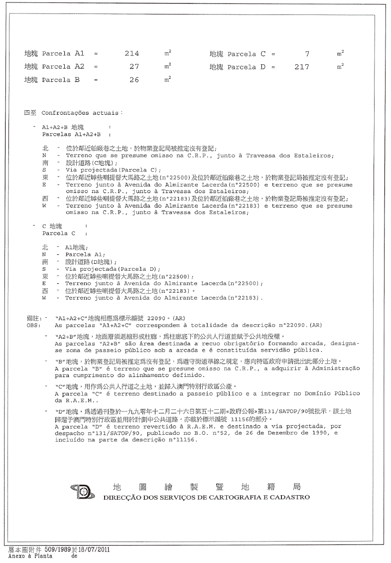 八、上述地塊在地圖繪製暨地籍局於二零一一年七月十八日發出的第509/1989號地籍圖中以字母“A1”、“A2”及“C”定界及標示,面積分別為214平方米、27平方米及7平方米。