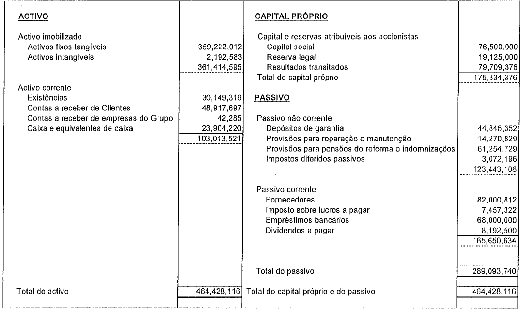 As demonstrações financeiras auditadas compreendem o balanço em 31 de Dezembro de 2012, e a demonstração dos resultados, a demonstração de alterações no capital próprio e a demonstração dos fluxos de caixa do exercício findo naquela data, e um resumo das principais políticas contabilísticas e outras notas explicativas.