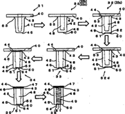 [57] Resumo : 本發明提供一種間隔螺母的製造方法,不採用數控車床,採用現有的衝壓加工設備即可進行加工,部件供應成本低,而且製造效率高,製造成本低。間隔螺母配置於箱體和基板之間,該基板配置於上述箱體內,所述間隔螺母用於使上述基板從上述箱體離開預定間隔尺寸並固定,該間隔螺母的製造方法具備下述工序:第一工序,通過對具有預定厚度尺寸的金屬板材進行衝壓加工而形成具有預定長度的突起部;第二工序,對上述突起部進行鍛造而使該突起部成形為有底圓筒形的軸部,並且通過對上述軸部的基端部的周緣進行衝壓加工而形成凸緣部;第三工序,通過對上述軸部的末端部進行衝壓加工而形成開口部;第四工序,朝徑向內側衝壓上述軸部的基端部,並沿著上述軸部的周向形成槽部;第五工序,通過沿著上述凸緣部的外周進行衝壓加工而形成細齒部,並且通過衝壓加工將上述凸緣部從上述金屬板材沖裁下來;以及第六工序,在上述軸部的內周面部形成螺紋槽。