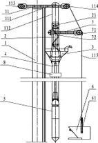 [57] Resumo : 本實用新型提供一種具有底部出料裝置的振沖設備的提升機構,其包括一其下端出口用於連接下料管(4)的集料斗(3),其上端設有一升降連接結構,用於與樁杆或桅杆(1)連接,所述集料斗(3)上連接的所述升降連接結構為固定在集料斗(3)上的料斗提升立柱(2),其上設有滑輪(21)用於與桅杆(1)上的相應的滑輪裝置(111)中的鋼絲繩(112)連接,固定在所述集料斗(3)上置於集料斗(3)上方的所述料斗提升立柱(2)上鉸接一懸臂橫樑(7),在所述料斗提升立柱(2)上位於懸臂橫樑(7)橫向設置的對應位置上設置一擋板(72),所述懸臂橫樑(7)支撑在所述擋板(72)上,在該懸臂橫樑(7)的外端設置一滑輪(71)。該提升機構為提升料斗(6)順利向集料斗(3)中傾倒填充料提供了方便。