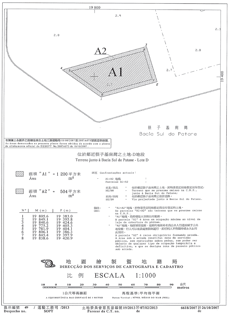 7. O lote D, com a área de 1 704 m2, encontra-se demarcado e assinalado com as letras «A1» e «A2», respectivamente, com a área de 1 200 m2 e 504 m2, na planta n.º 6 618/2007, emitida pela Direcção dos Serviços de Cartografia e Cadastro, adiante designada por DSCC, em 26 de Outubro de 2007, e não está descrito na Conservatória do Registo Predial, adiante designada por CRP.