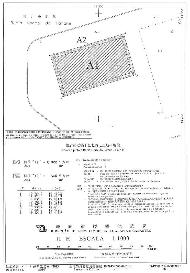 O primeiro outorgante concede ao segundo outorgante, por arrendamento e precedido de concurso público, um terreno não descrito na CRP, situado junto à Bacia Norte do Patane, designado por lote E, na península de Macau, com a área de 2 967 m2 (dois mil, novecentos e sessenta e sete metros quadrados), de ora em diante designado, simplesmente, por terreno, que se encontra assinalado com as letras «A1» e «A2» na planta n.º 6 619/2007, emitida pela DSCC em 26 de Outubro de 2007, ao qual é atribuído o valor de $ 867 928 000,00 (oitocentos e sessenta e sete milhões, novecentas e vinte e oito mil patacas).