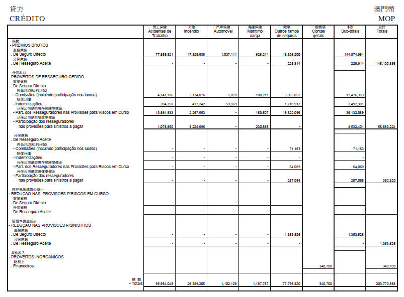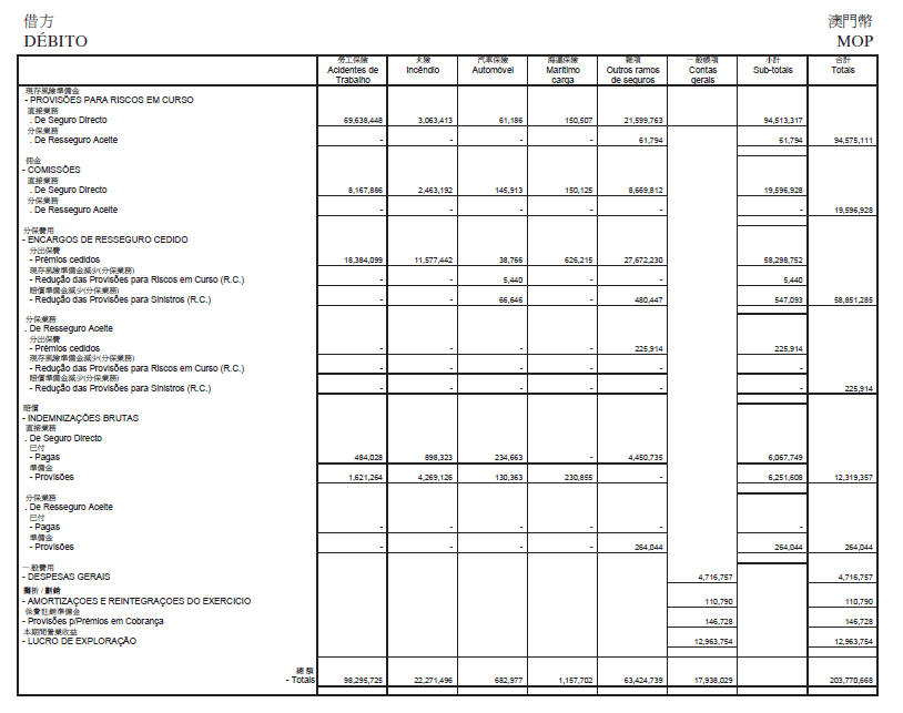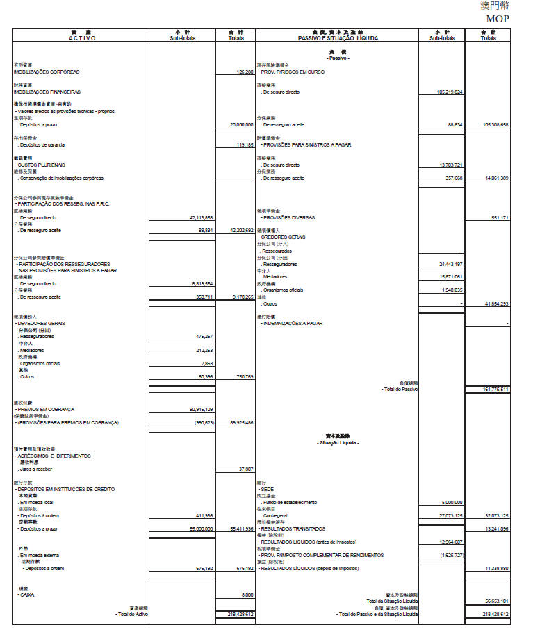 本澳門分行經營一般保險業務:如勞工保險,產物保險,運輸保險,個人意外及旅遊保險,汽車保險等……於二零一二年度營業額為澳門幣145,100,898圓及純利為澳門幣11,338,880圓。