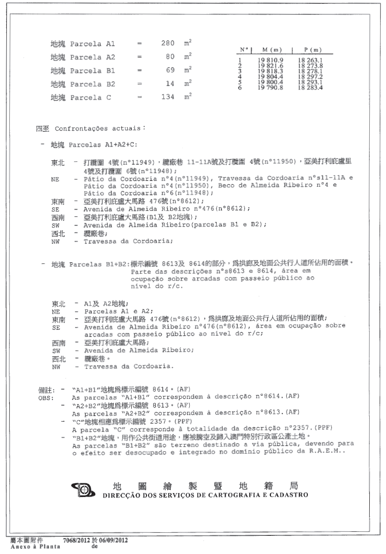 十三、由於標示於物業登記局第2357號、第8613號及第8614號的讓與標的土地在物業登記局第165150C號有一以中國銀行股份有限公司名義登錄的抵押負擔,因此該實體已根據法律的規定,聲明批准註銷在第7068/2012號地籍圖中以字母“B1”和“B2”標示,總面積83平方米,將會納入公產的地塊的抵押,並批准將在上述地籍圖中以字母“A1”、“A2”及“C”標示,總面積494平方米的地塊的抵押負擔改為以租賃批給所衍生的權利來設定。