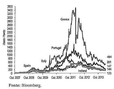 Com a recuperação da actividade e com a Reserva Federal americana a sinalizar uma atenuação do quantitative easing, as yields dos Treasuries e dos Bunds a 10 anos subiram, em 2013, de 1.758% para 3.029% e de 1.316% para 1.929%, respectivamente. A perspectiva de uma subida dos juros de mercado na economia americana, bem como de uma apreciação do dólar e de uma liquidez menos acessível, gerou um aumento da volatilidade nos mercados financeiros a partir de Maio e penalizou, em particular, os mercados emergentes. No Brasil, o real depreciou-se cerca de 13% face ao USD e perto de 17% face ao EUR, enquanto o índice Bovespa recuou 15.5%. Com uma procura interna dinâmica e enfrentando pressões inflacionistas, dada uma inflação próxima de 6%, o Banco Central elevou a taxa de juro SELIC de 7.25% para 10% em 2013 (e para 10.5% já no início de 2014). A economia brasileira cresceu 2.3% em 2013, mas com uma deterioração sucessiva das expectativas de crescimento para 2014 (para para cerca de 2%).