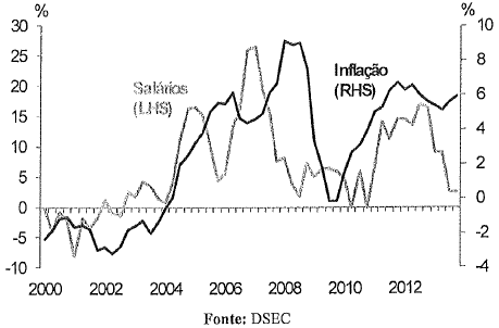 Figura 3: Mediana dos salários (%, y-o-y) e Inflação homóloga (%).