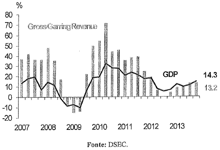 Macau apresentou um crescimento de 11.9% em 2013, um resultado bastante positivo que revela uma aceleração da actividade face ao registo de 9.1% do ano anterior. Para o bom desempenho da economia muito contribuiu a forte performance das exportações, em especial das exportações de serviços associados ao sector do Jogo e Turismo, que se mantêm como principal driver de crescimento. No conjunto do ano, as receitas do Jogo cresceram 18.6%, espelhando o forte dinamismo do sector. As exportações de bens mantiveram-se, igualmente, em trajectória crescente, contribuindo de modo significante para a boa performance da economia.
