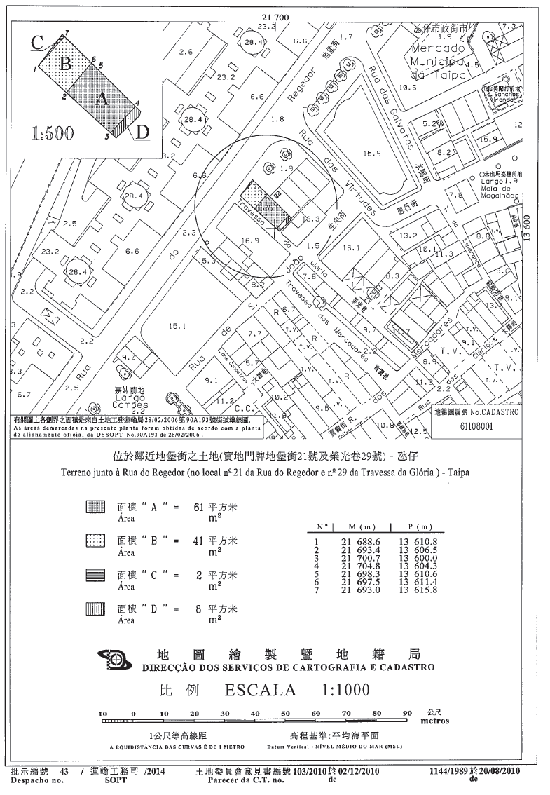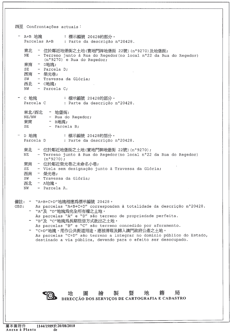 六、屬完全所有權制度,面積69平方米的地塊,在地圖繪製暨地籍局於二零一零年八月二十日發出的第1144/1989號地籍圖中以字母“A”及“D”定界及標示,而面積分別為61平方米及8平方米﹔以長期租借制度批出,面積43平方米的地塊,在同一地籍圖中以字母“B”及“C”定界及標示,而面積分別為41平方米及2平方米。