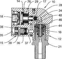 [57] Resumo : 本發明涉及一種用於氣動工具(尤為手持工具)的緩壓裝置(10),其具有用於連接壓力輸入源的壓力連接設備(12)、用於連接所述氣動工具的工作壓力輸出端以及用於使壓力輸入管道(16)與工作壓力室(17)相分離的緩壓閥(14),其中,緩壓閥具有一雙重作用的閥門活塞(26),其具有一逆反於閥門彈簧(29)的彈力方向來加載工作壓力的工作壓力活塞面以及一在閥門彈簧的彈力方向上加載輸入壓力的密封活塞面(28),密封活塞面(28)用於將壓力輸入管道相對於工作壓力室密封,其中,工作壓力室通過一通風管道(40)與一建構在壓力連接設備上的通風設備相連,壓力輸入源的連接件(21)使通風設備的通風活塞(44)保持在閉合狀態時,通風活塞(44)被加載工作壓力。