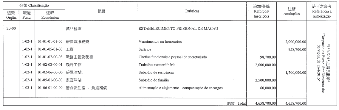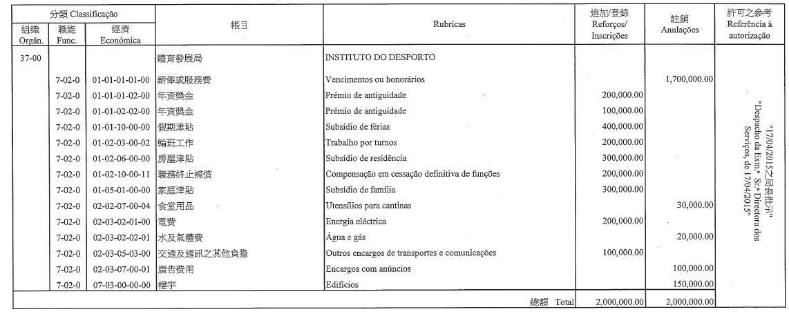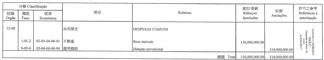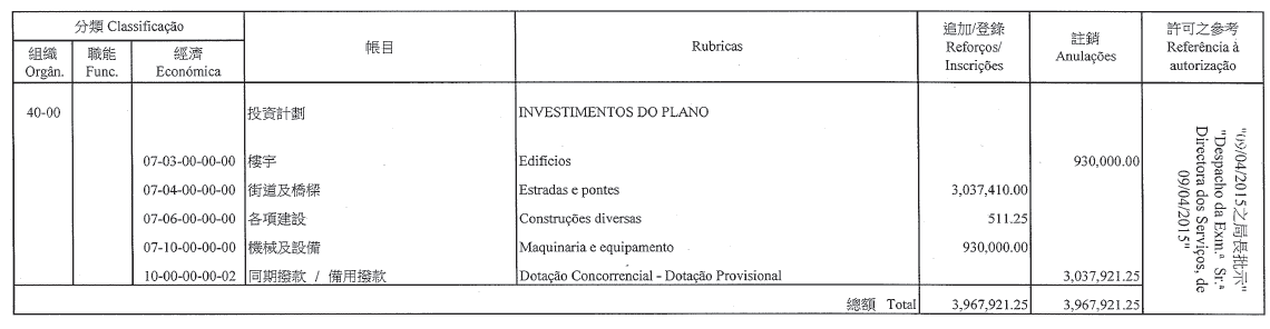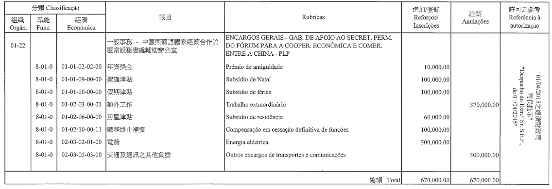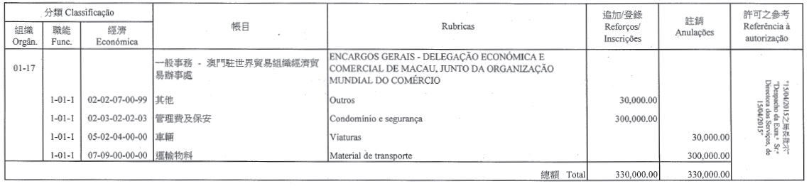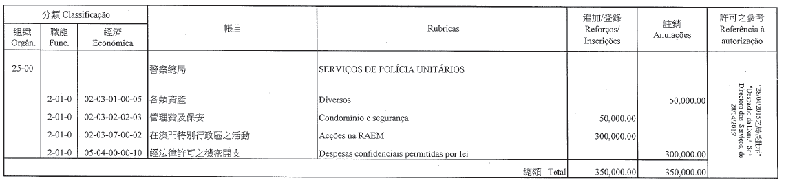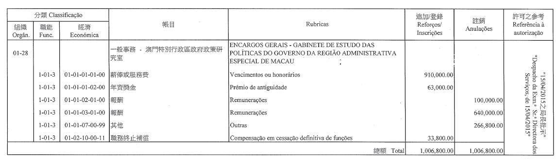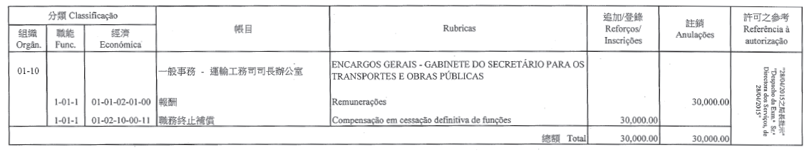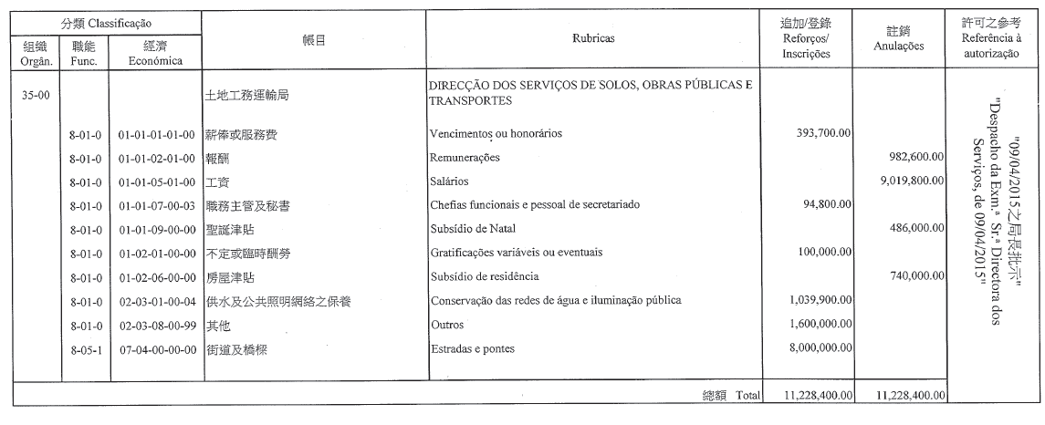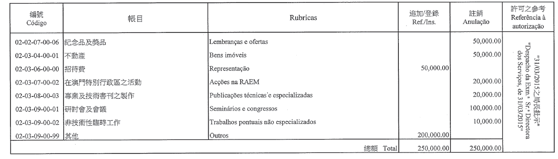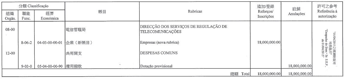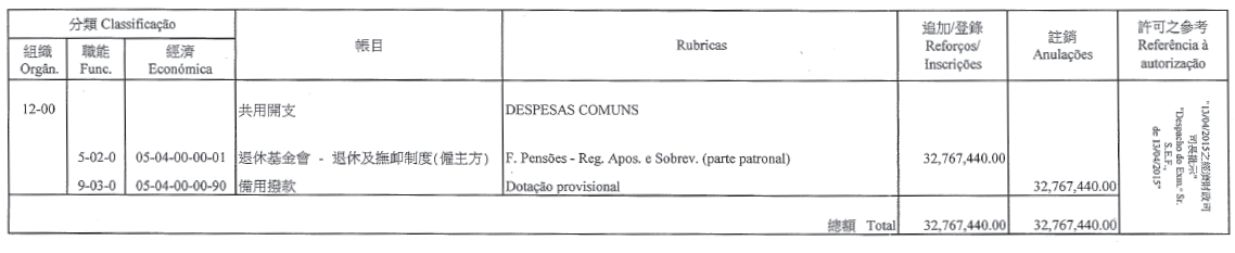 — De acordo com o disposto no n.º 2 do artigo 9.º da Lei n.º 9/2014, publicada no Boletim Oficial da Região Administrativa Especial de Macau n.º 52, I Série (2.º Suplemento), de 31 de Dezembro, publicam-se as seguintes alterações à distribuição da verba global do capítulo 12 com as classificações funcional 8-01-0 e económica 04-01-05-00-08 da tabela de despesa corrente do Orçamento da Região Administrativa Especial de Macau para o corrente ano económico, sob a designação: «Transferências Correntes — Sector Público — Outras — Comissão de Segurança dos Combustíveis», autorizadas nos termos do n.º 2 do Despacho do Chefe do Executivo n.º 347/2006: